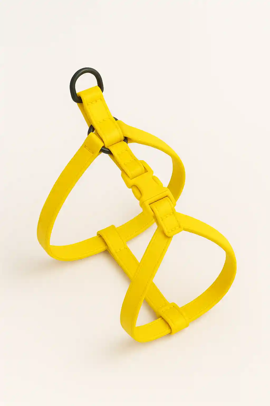 Żółte szelki dla małego psa z wytrzymałego PCV. Wodoodporne, lekkie i wygodne – zapewniają bezpieczne i komfortowe spacery każdego dnia.
